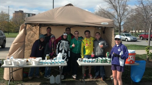And there, just as I hit the aid station in Lincoln Park near the 5 mile marker, I see a beautiful band of runners in step, bouncing among them three small “3:05” signs. That’s my team. Let’s catch up.